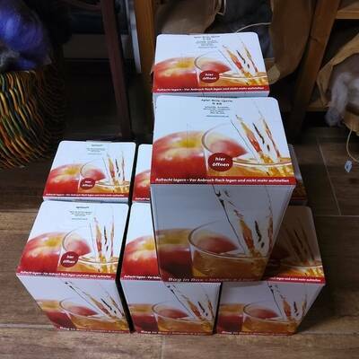 Zutaten: 65% Äpfel, 25% Birnen, 10% Quitten, keine weiteren Zusätze, kalt gepresst. Alles ungespritzt und ohne Kunstdünger.